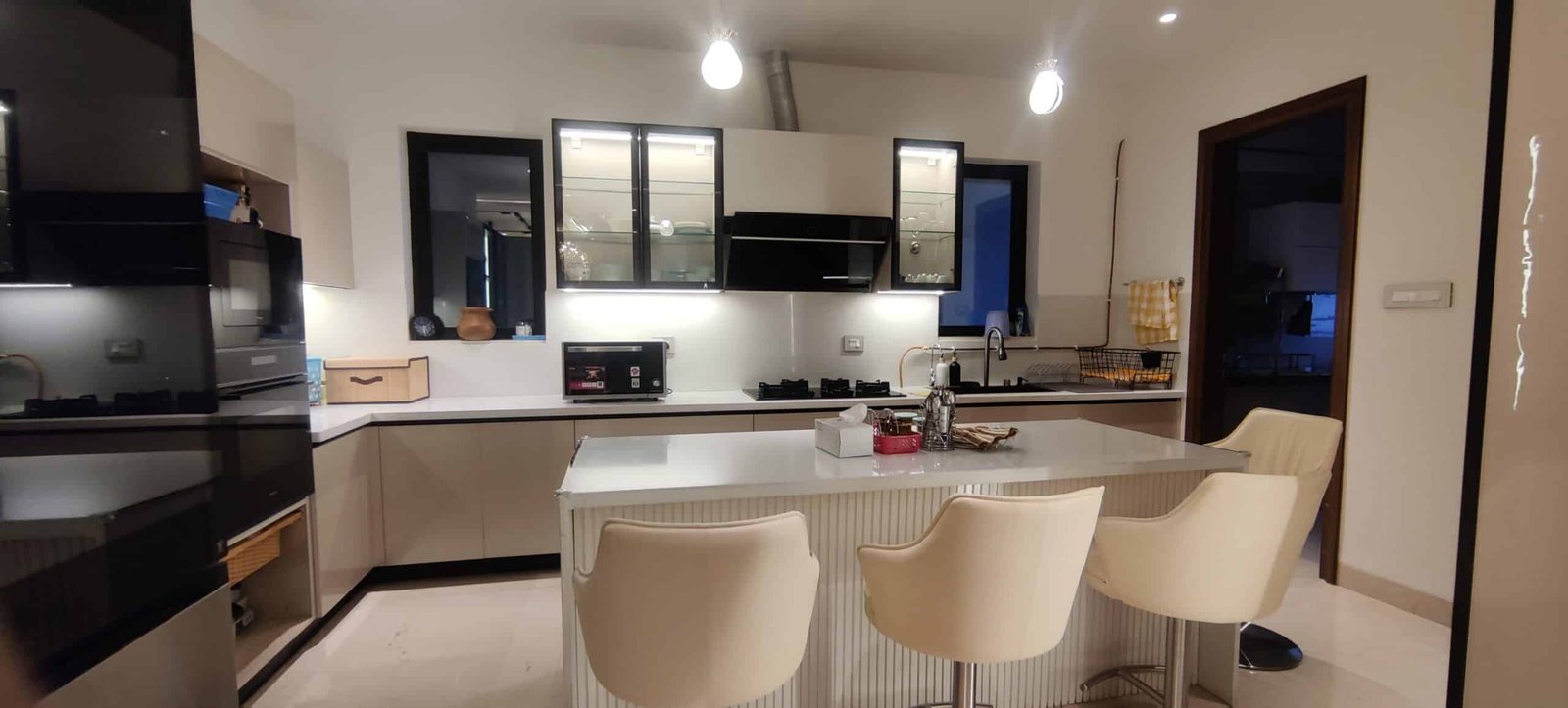 The modular kitchen is the heart of the home—sleek, efficient, and always ready for a family meal or late-night conversation. Full-length wardrobes line the bedrooms, their design echoing the home’s theme, offering ample storage without ever feeling imposing.